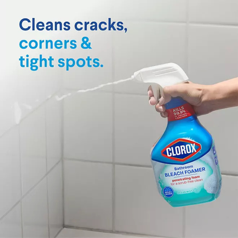 Clorox Bathroom Bleach Foamer is a handy foaming spray that offers powerful cleaning and disinfecting properties while requiring little effort on your part. 99.9% of bacteria and germs, including the COVID-19 virus, are eliminated by this bleach cleanser and sanitizer (1). This penetrating foam uses the power of Clorox bleach to remove mold, mildew, and soap scum stains with little to no scrubbing. Additionally, it keeps your bathroom looking cleaner for up to four weeks by inhibiting the formation of mold and mildew (2).