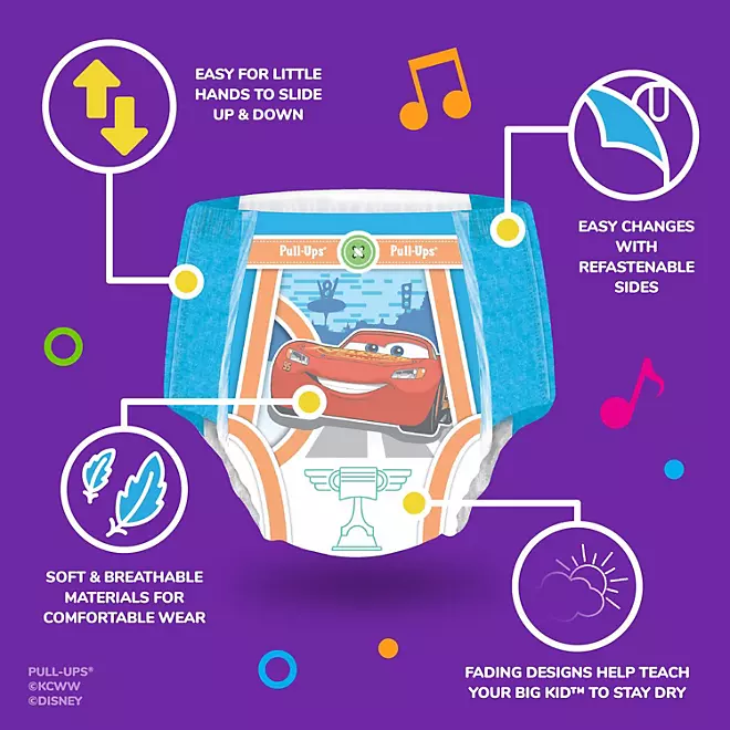 Disney’s Lightning McQueen is featured in two unique music designs included in each box. The images fade when wet, encouraging your child to stay dry. Fun additions like an inside-the-box coloring mat and interactive digital tools let Lightning McQueen come to life. The Pull-Ups brand can assist when your child is ready to start potty training. For professional information and advice on potty training, visit the Pull-Ups website. To date, we have assisted in training 60 million Big Kids.