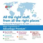 - Product Description: Advantage Premium infant formula milk-based powder with iron, available in 48 oz tub or 34 oz cannister