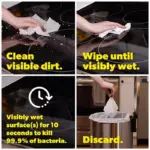 Use these easy methods to clean and disinfect hard, non-porous surfaces that do not come into touch with food. Before disinfecting, wipe down any surfaces that are obviously unclean. To properly disinfect, apply enough wipes to surfaces that are obviously damp for three minutes. The used wipe should be thrown in the trash after usage. Please be aware that flushing these wipes down the toilet is not advisable.