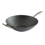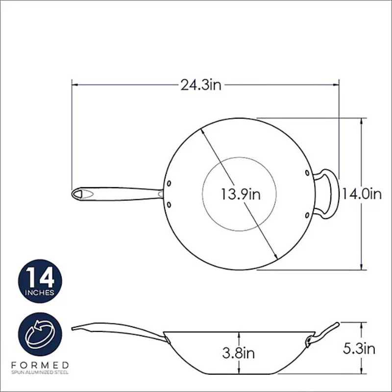 Made to withstand the rigors of a commercial kitchen, the restaurant line of cookware delivers serious performance and durability. An aluminized steel wok conducts heat rapidly across its cooking surface, resulting in quick searing of foods as you cook. This pan is authentically made using a time-honored spinning technique to produce sturdy results. The premium ceramic nonstick coating is very durable and made to withstand a lot of use, and contrary to popular belief, you can brown foods in a nonstick wok. The Ceramic nonstick is made without PFAS for cleaner cooking. The riveted handle features a sleek stainless steel handle. For gas, electric, glass top and induction stoves. Proudly made by Nordic Ware, a family owned company.